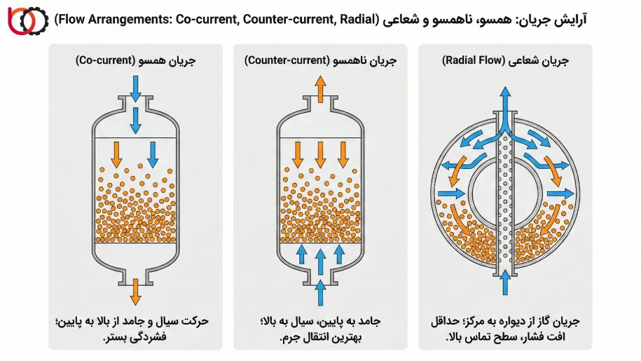 - جریان همسو (Co-current): هم سیال و هم جامد از بالا به پایین حرکت میکنند. این حالت کمتر رایج است زیرا نیروی درگ سیال باعث فشردگی بیش از حد بستر میشود.