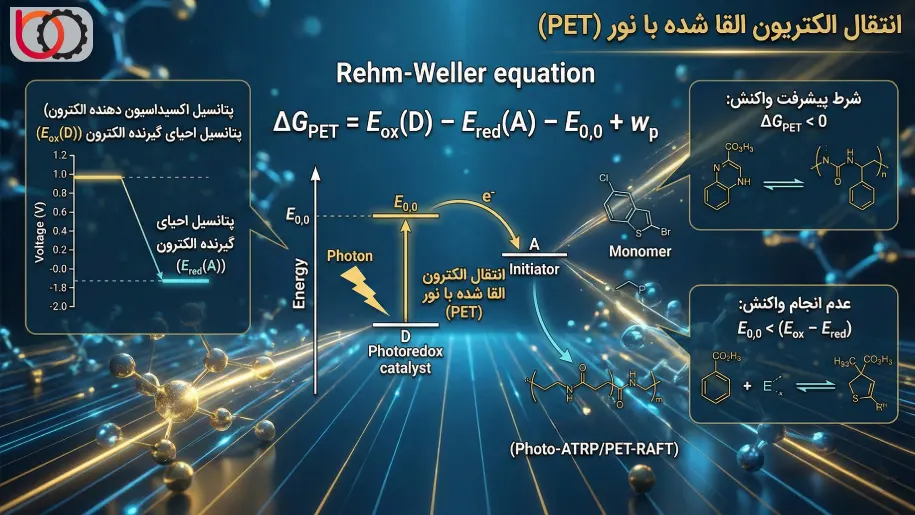 مکانیسم غالب در اکثر سیستمهای Photo-ATRP و PET-RAFT، فرآیند انتقال الکترون (Electron Transfer) است. ما برای تعیین امکانپذیری ترمودینامیکی این انتقال، از معادله رایم-ولر (Rehm-Weller Equation) استفاده میکنیم. این معادله تغییر انرژی آزاد گیبس ($\Delta G_{PET}$) را محاسبه میکند: