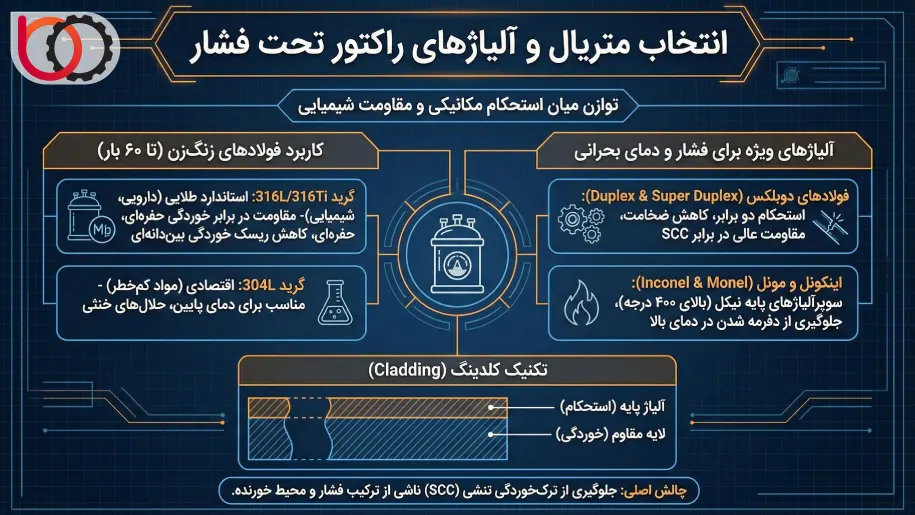 یکی از حساسترین تصمیمات مهندسی در طراحی راکتور تحت فشار، انتخاب متریالی است که بتواند همزمان فشار داخلی مخزن و تهاجم شیمیایی سیال را تحمل کند. در راکتورهای اتمسفریک، شاید تنها دغدغه ما خوردگی باشد، اما وقتی پای فشار در میان است، «تنش تسلیم» (Yield Strength) و «تنش کششی» (Tensile Strength) آلیاژ تعیینکننده ضخامت نهایی و ایمنی تجهیز هستند. انتخاب نادرست آلیاژ در یک مخزن تحت فشار، میتواند منجر به پدیده فاجعهبار «ترکخوردگی تنشی» (Stress Corrosion Cracking – SCC) شود؛ جایی که ترکیب فشار و محیط خورنده باعث شکست ناگهانی راکتور میشود.
