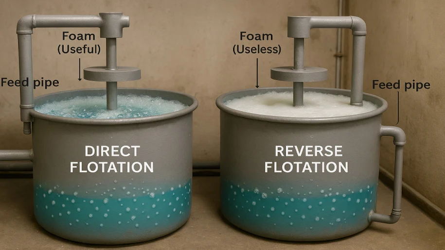 مکانیزم در عمل: پس از اضافه شدن این مواد، پالپ وارد دستگاهی به نام سلول فلوتاسیون میشود. در این سلول، یک همزن (Impeller) مواد را معلق نگه داشته و همزمان، هوا از کف به داخل آن دمیده میشود. ذرات ماده معدنی که اکنون آبگریز شدهاند، به حبابهای هوا چسبیده و به سمت سطح حرکت میکنند. در سطح، این حبابها یک کف غلیظ و سرشار از ماده معدنی را تشکیل میدهند که به صورت مکانیکی توسط پاروهایی جمعآوری میشود. سنگهای باطله که آبدوست باقی ماندهاند، به حبابها نمیچسبند و در ته سلول تهنشین میشوند.